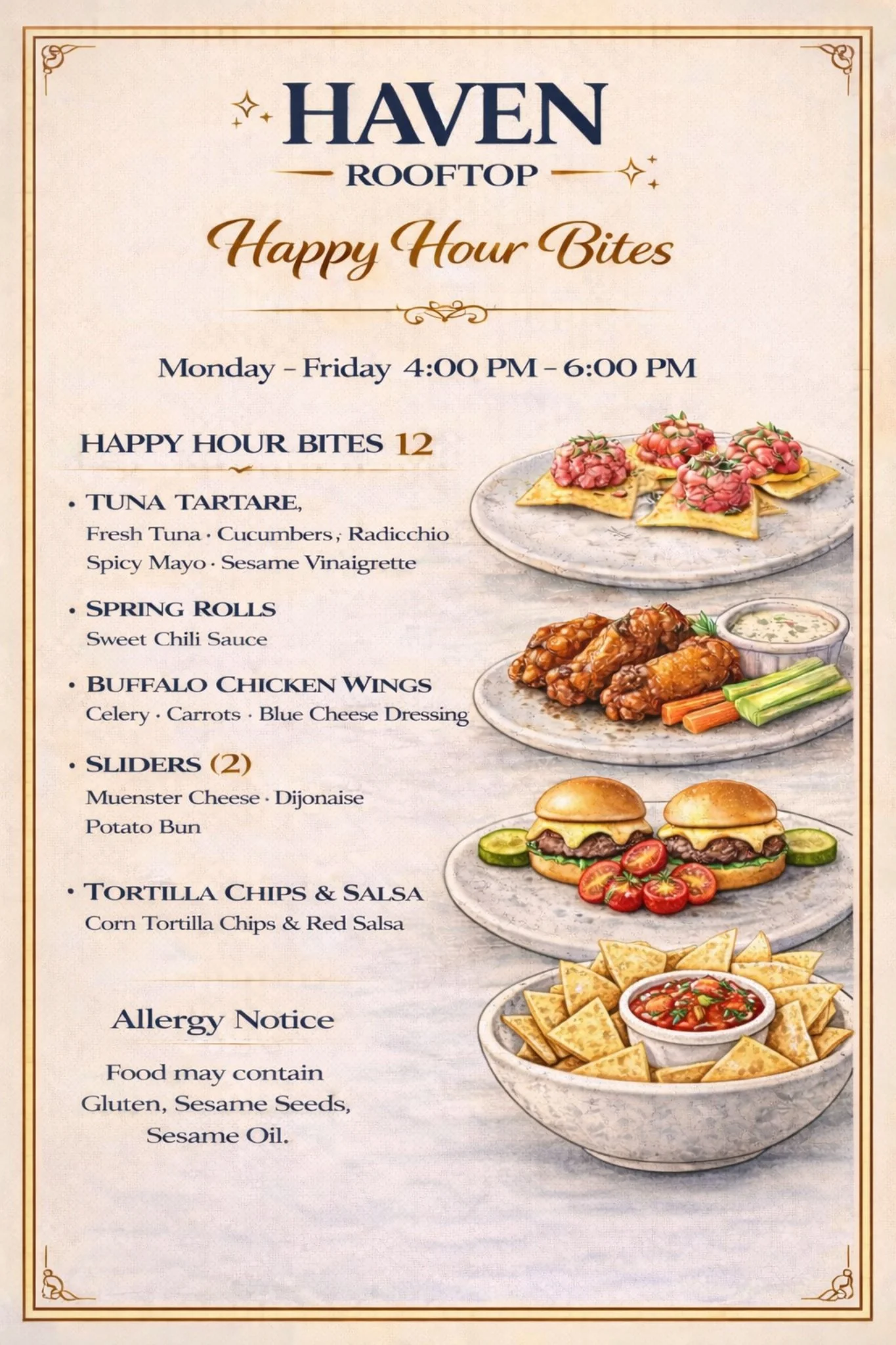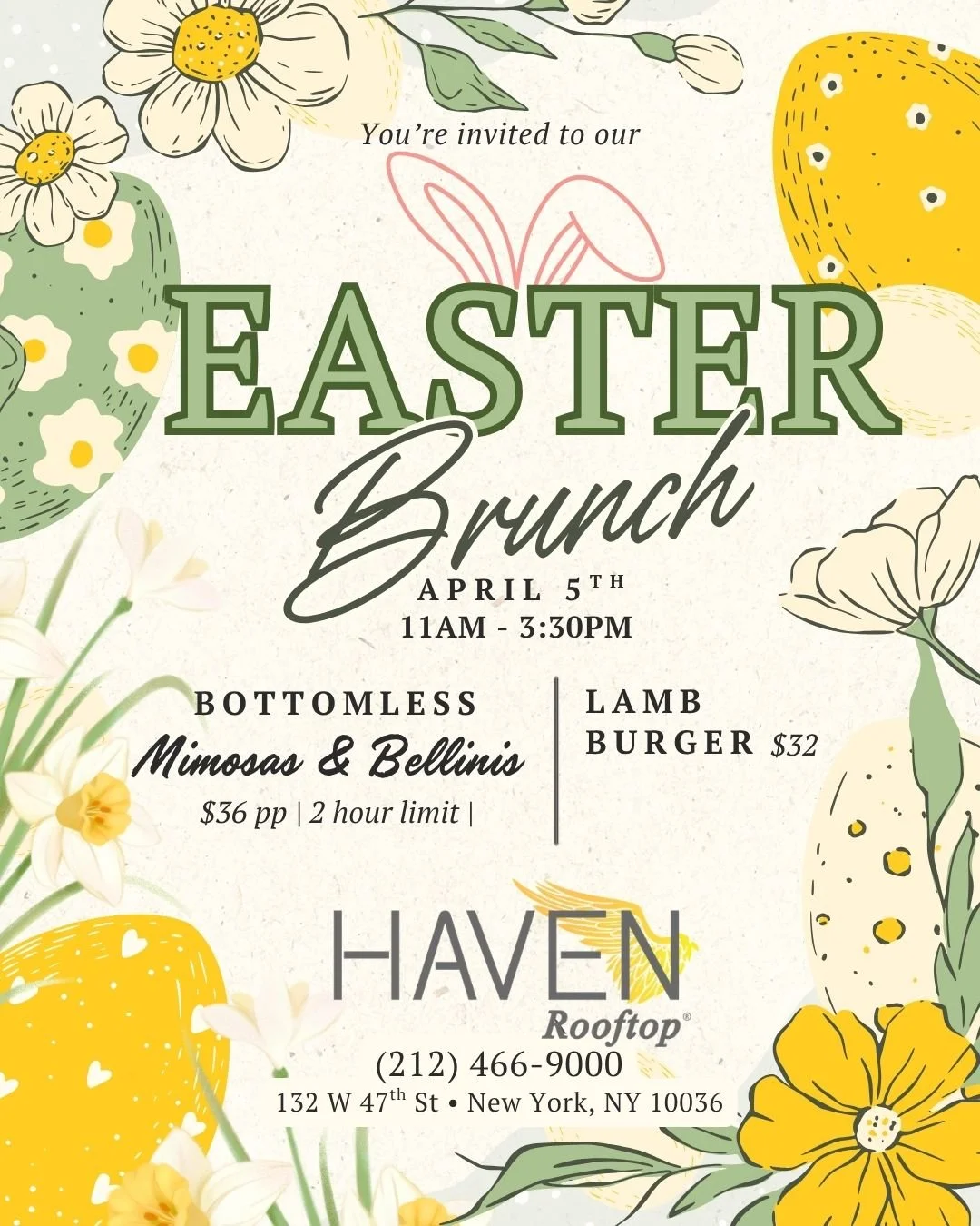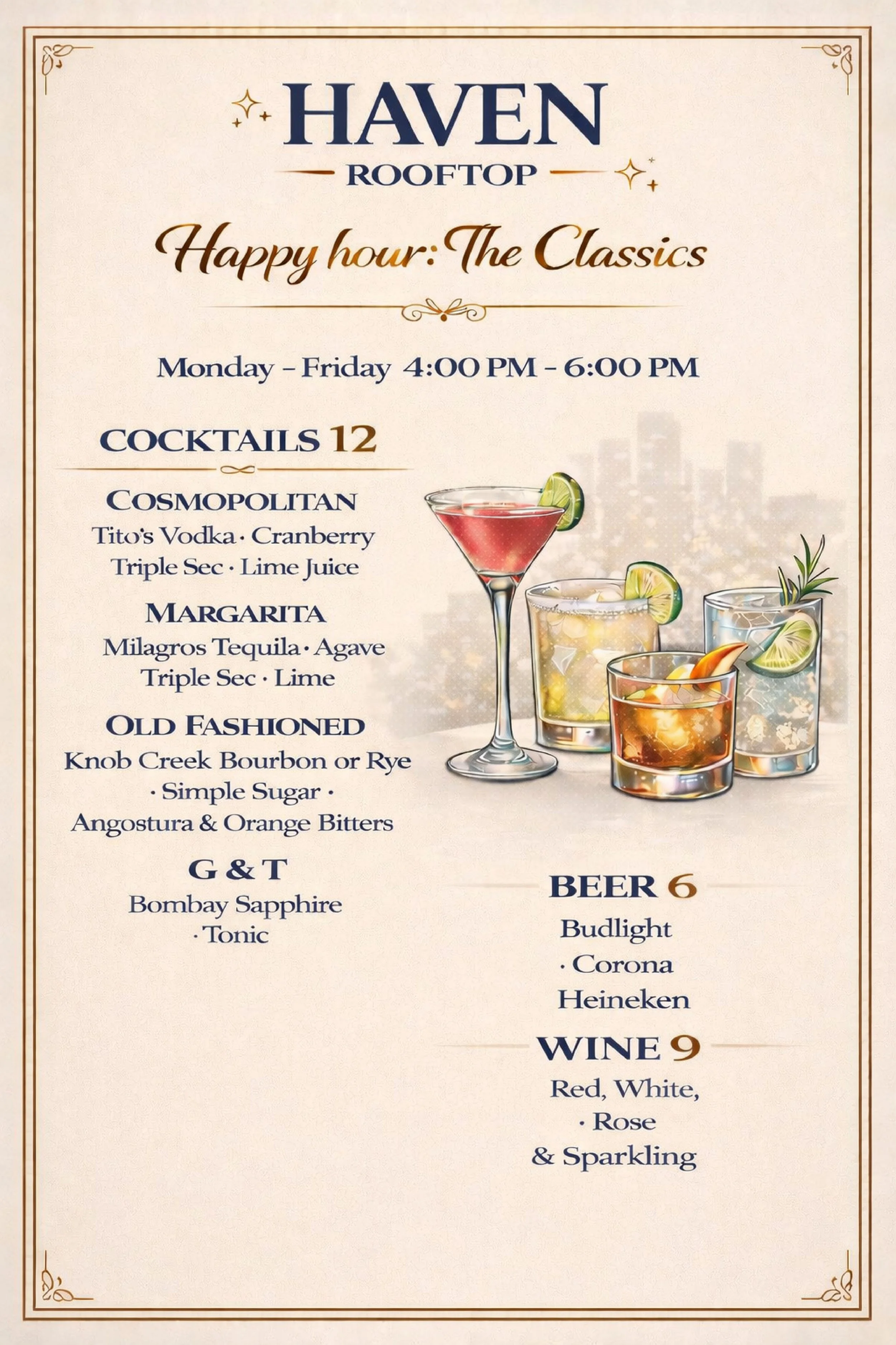 Do happy hour and brunch in style at Haven Rooftop, home to some of the best views in Midtown Manhattan. Enjoy our delicious weekend daytime brunch experience with craft cocktails and an exuberant atmosphere or come in for weekday happy hour Monday-Friday 4-6pm.